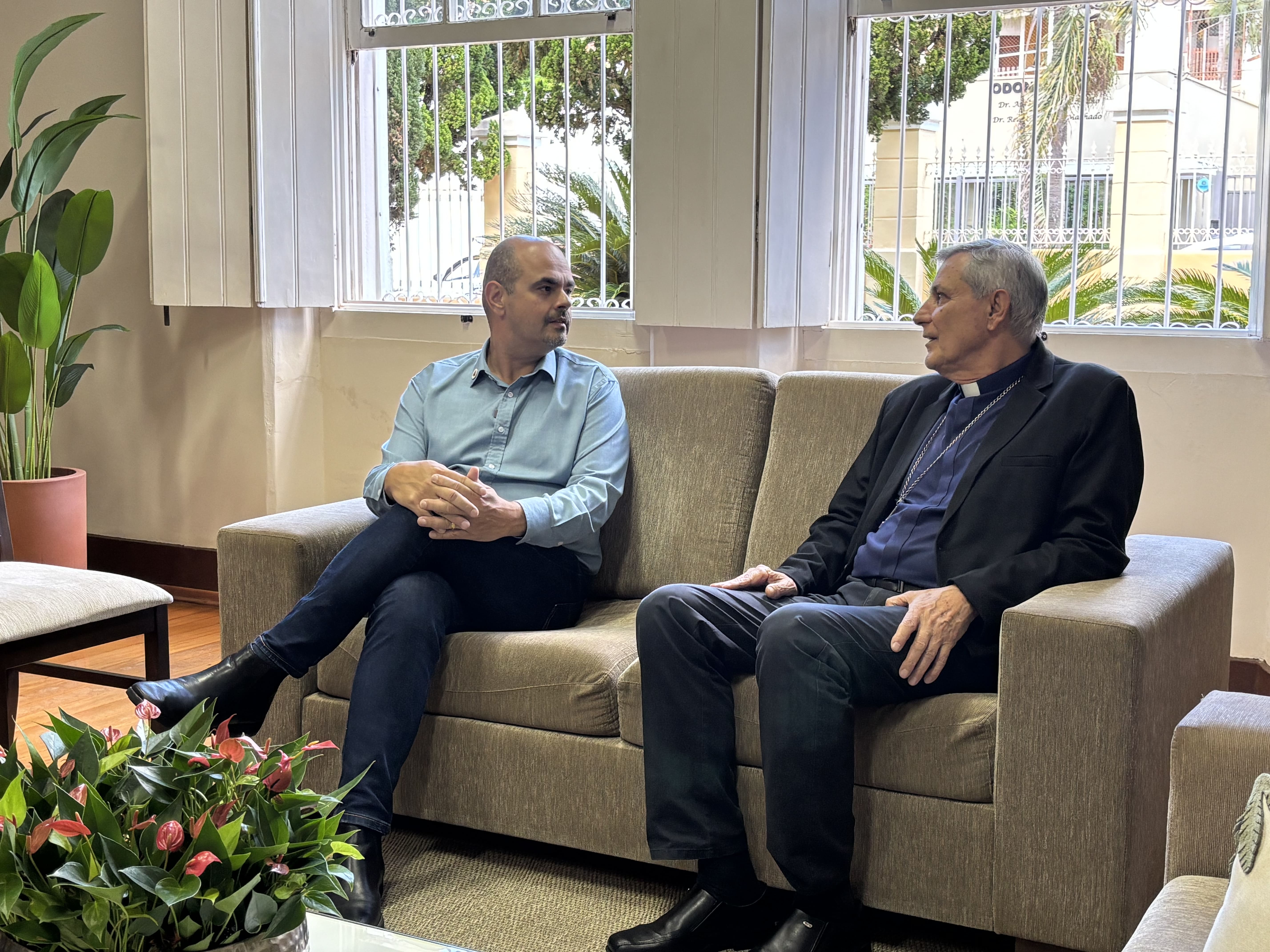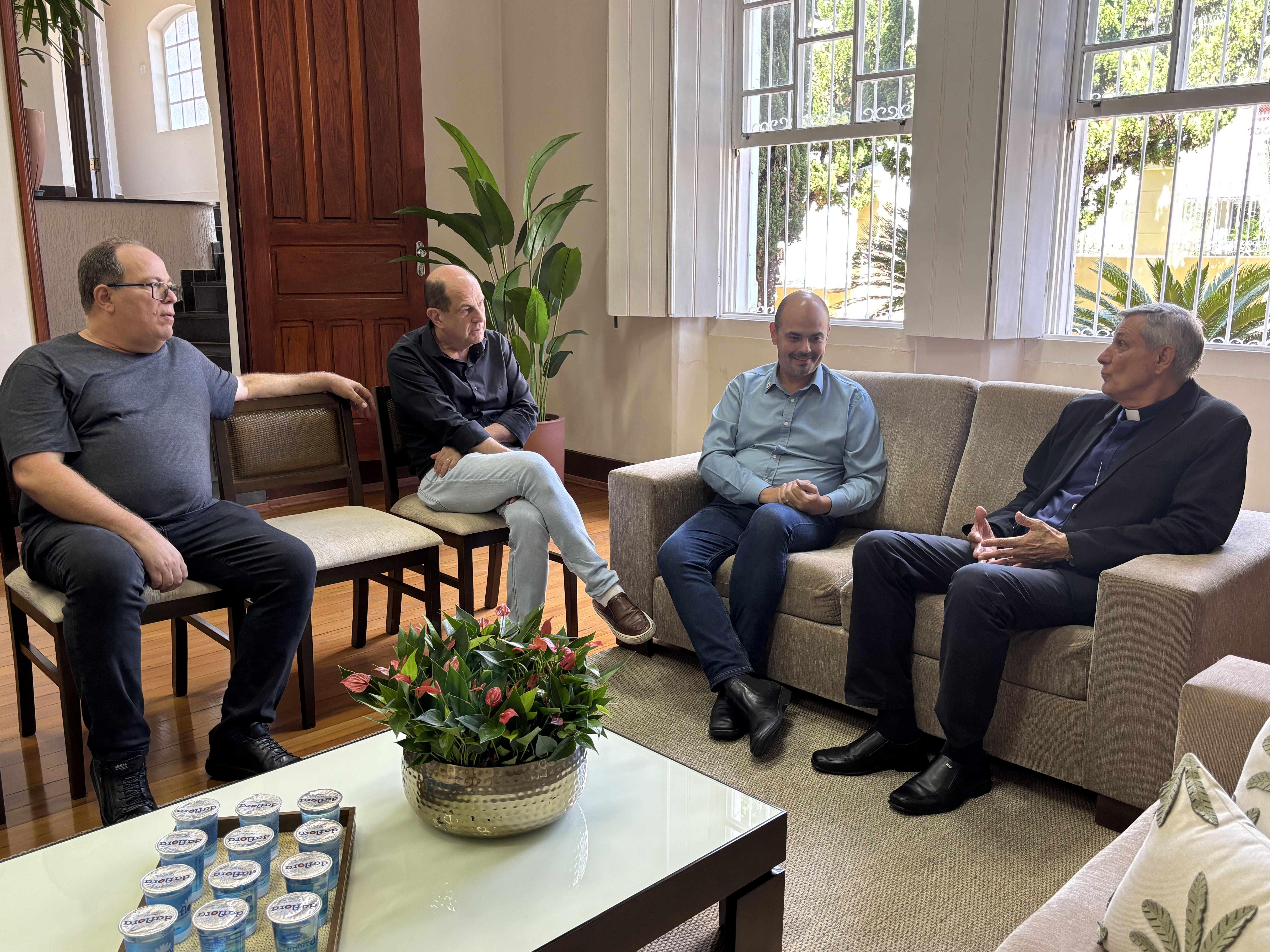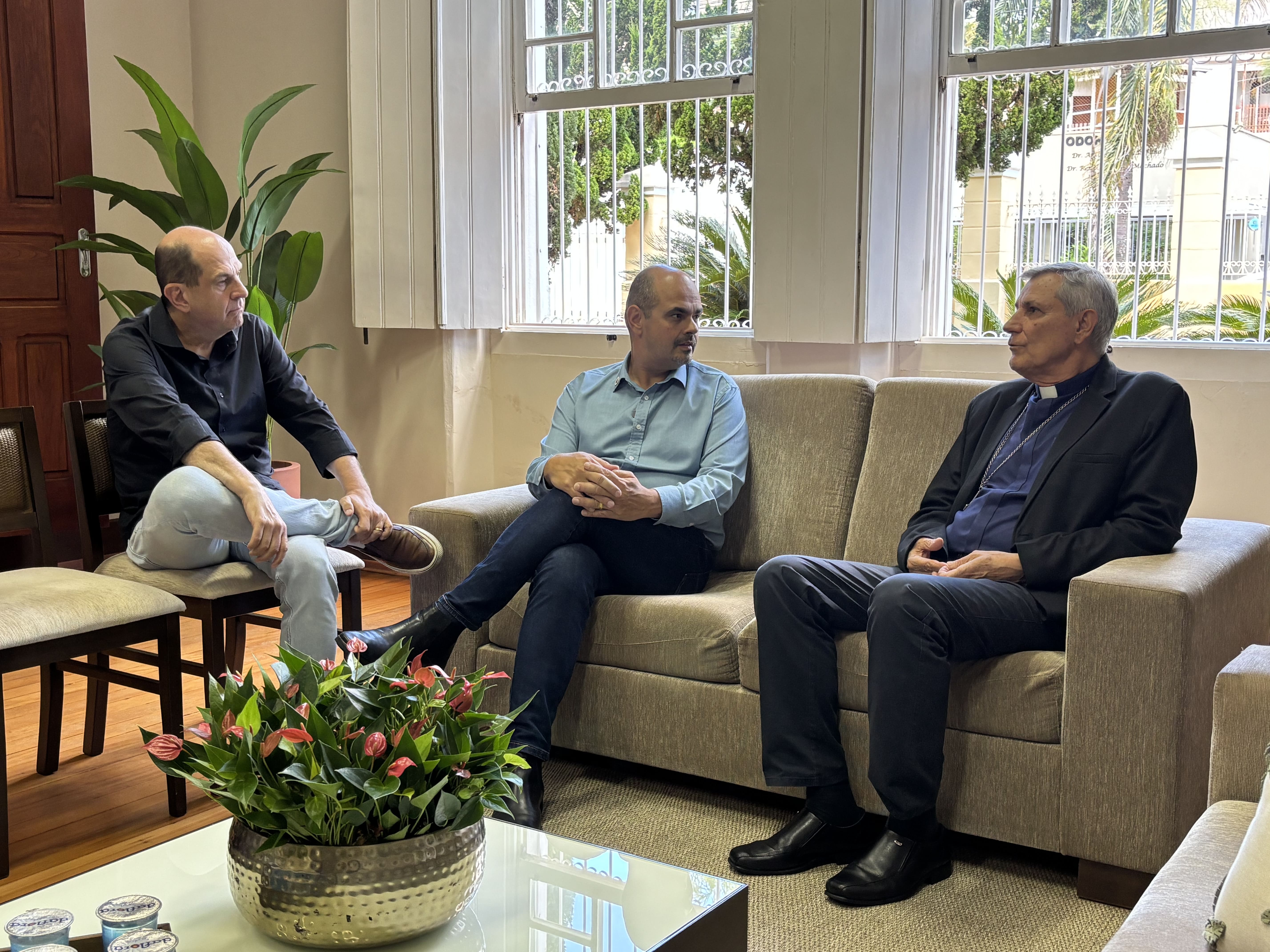 O governador de Minas Gerais Mateus Simões se reuniu, na quinta-feira (9/4), com o bispo da Diocese de Guaxupé, Dom José Lanza Neto. O encontro foi realizado na sede da diocese e contou com a presença com representantes do clero do Sul de Minas. A reunião teve como objetivo fortalecer o diálogo institucional com as lideranças religiosas locais e discutir pautas de interesse da região.