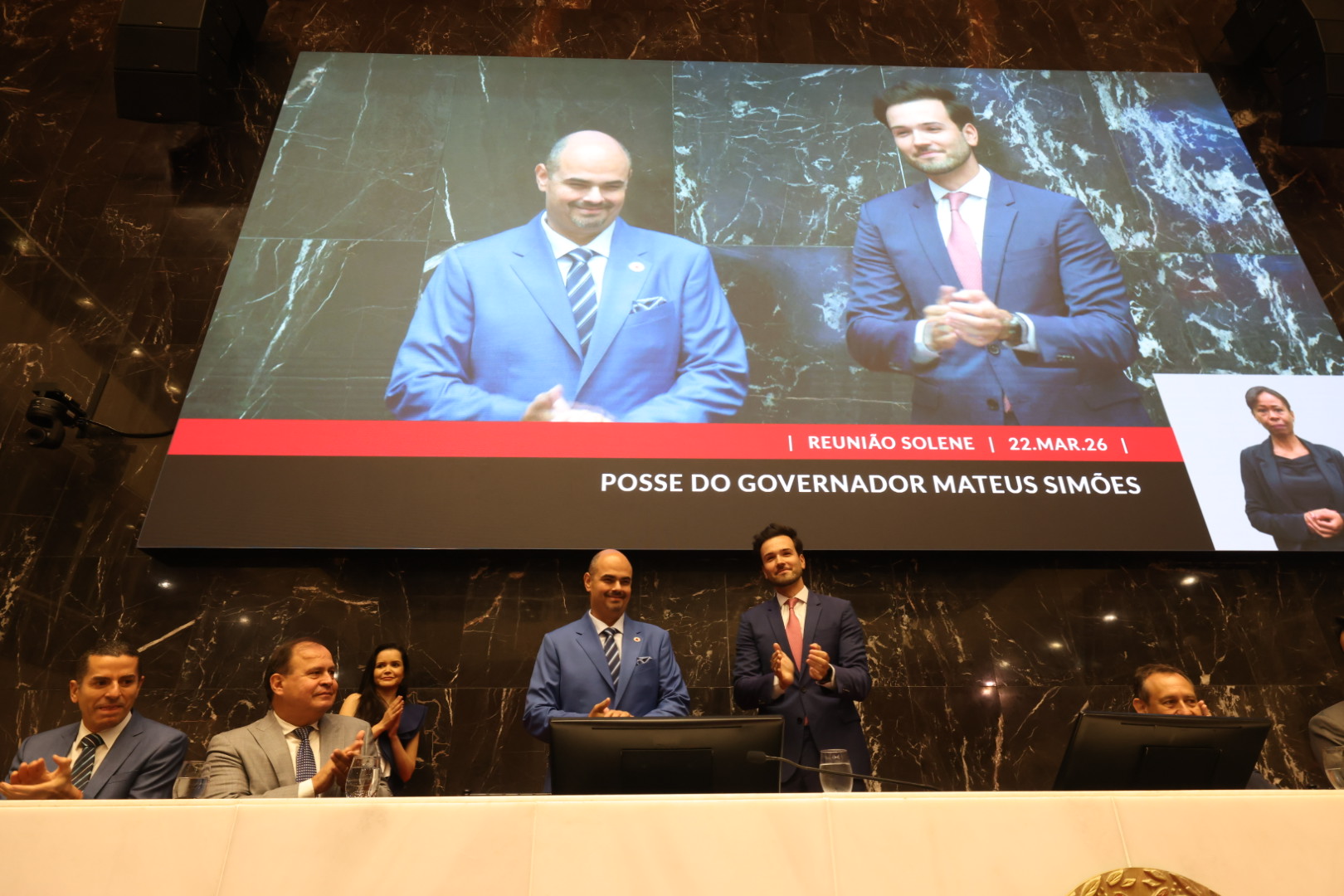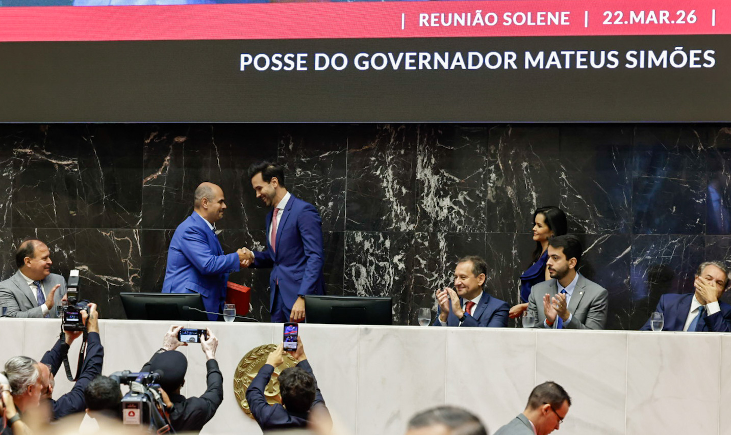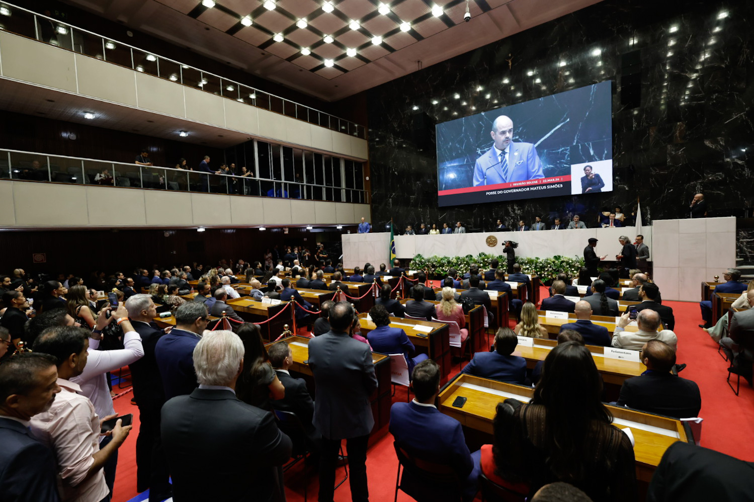 Mateus Simões tomou posse como governador de Minas Gerais neste domingo (22/3), durante Reunião Solene do Plenário da Assembleia Legislativa de Minas Gerais (ALMG). A cerimônia foi conduzida pelo presidente da Casa, o deputado estadual Tadeu Martins Leite. O novo chefe do Executivo estadual substitui o governador Romeu Zema, que renuncia ao cargo a partir deste domingo.