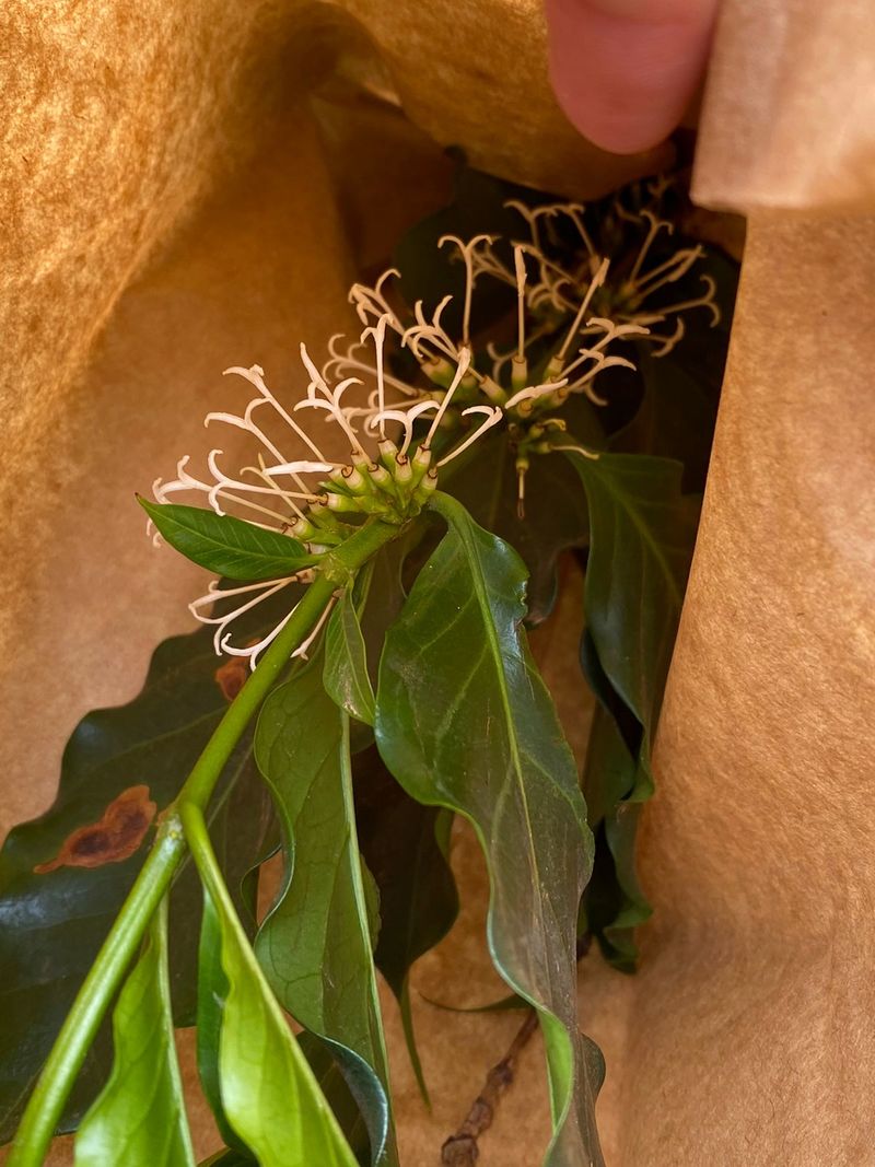 “De dois a três dias antes da florada a gente faz o processo da emasculação, que consiste na retirada da parte masculina da flor, evitando a polinização natural e permitindo um controle mais preciso sobre os cruzamentos. Na sequência, a gente protege o ramo com um saco de papel e no dia da abertura da florada, fazemos a polinização manual com flores abertas (pólen) de cultivares com as características desejadas”, explica.