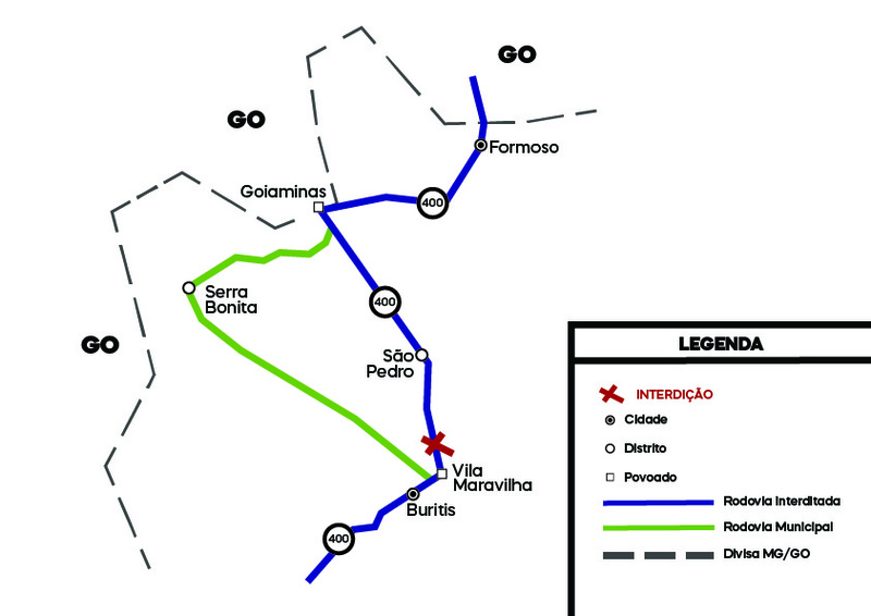 O Departamento de Estradas de Rodagem de Minas Gerais (DER-MG) informa que o tráfego de veículos na rodovia MG-400, no Km 60,3, trecho que liga os municípios de Buritis e Formoso, na região Noroeste de Minas Gerais, está totalmente interditado.