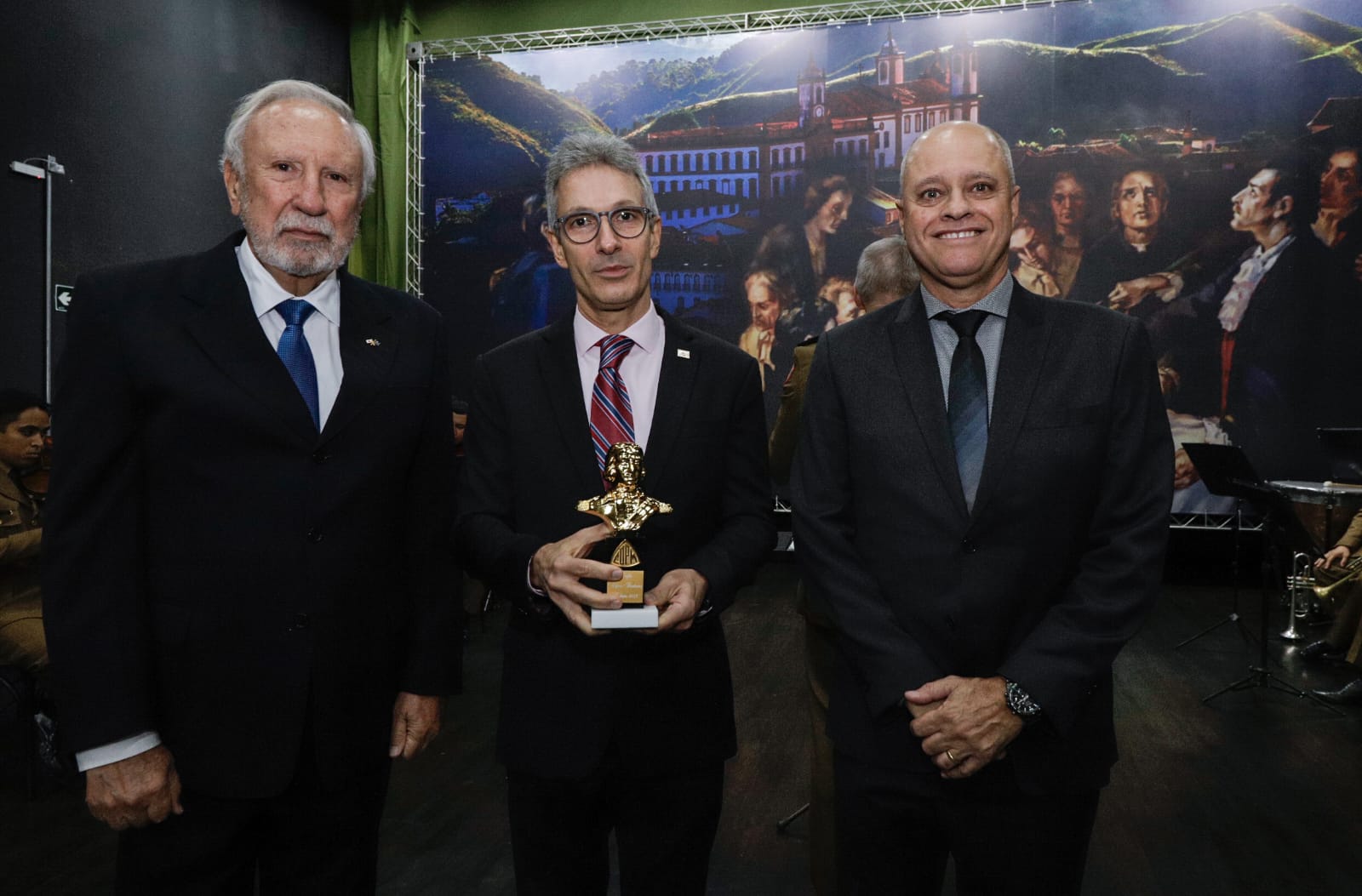 O governador Romeu Zema foi agraciado, nesta segunda-feira (24/4), no Clube dos Oficiais Militares Mineiros (COMM), em Belo Horizonte, com o Troféu Alferes Tiradentes. A condecoração reconhece 81 pessoas e entidades que tenham, de alguma forma, se destacado para o desenvolvimento das ciências, artes, assistência e defesa social no estado de Minas Gerais.