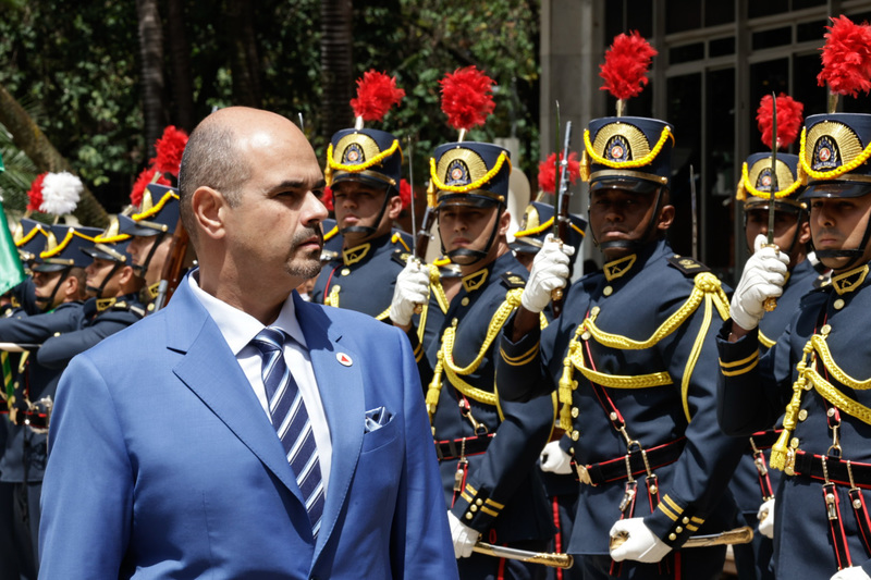 O novo governador de Minas foi recebido na ALMG por uma comitiva de deputados estaduais na porta do Salão Nobre, após atravessar o Hall das Bandeiras e passar por um corredor formado pelos Dragões da Inconfidência – grupamento de honra da Polícia Militar de Minas Gerais (PMMG).