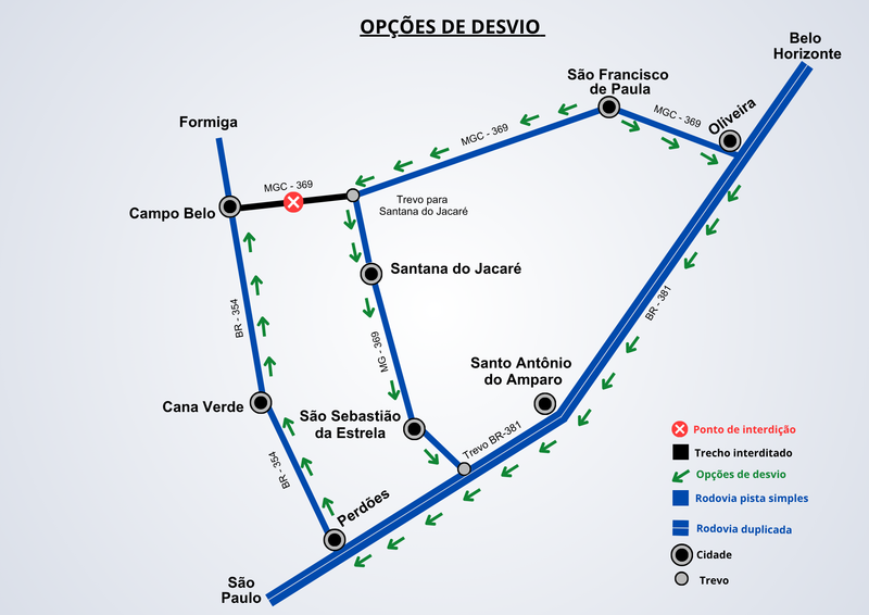 Para minimizar os impactos no tráfego, motoristas que saem de Oliveira com destino a Campo Belo podem seguir por Santana do Jacaré, acessar a BR-381, passar por Perdões e então chegar ao destino.