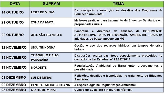 Até dezembro serão promovidas nove edições do programa, em todas regionais estaduais de meio ambiente de Minas Gerais, sempre com temas ambientais de interesse comum.