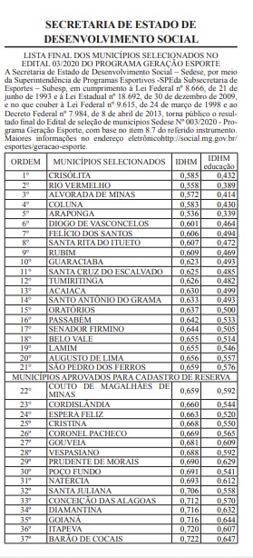A Secretaria de Estado de Desenvolvimento Social (Sedese) divulgou, nesta quarta-feira (18/11), o resultado final dos municípios selecionados para a execução do Programa Geração Esporte 2020/2021. Foram selecionadas 21 cidades para firmar convênio com o Estado. Os demais municípios aprovados irão compor cadastro de reserva.