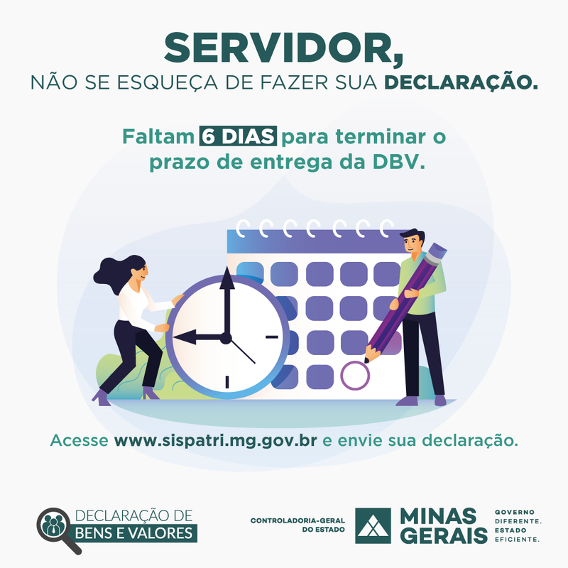 Termina, no dia 30/6, o prazo para entrega da Declaração de Bens e Valores (DBV), relativa ao ano de 2020, obrigatória para todos os agentes públicos ativos no Estado de Minas Gerais. O documento deve ser preenchido no Sistema de Registro de Bens dos Agentes Públicos (Sispatri), e a inadimplência pode acarretar processos administrativos disciplinares e até demissão.